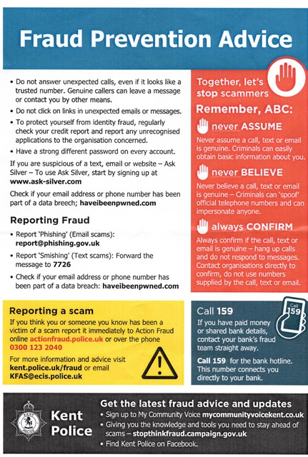 This issue has become a major problem and seems likely to get worse as the scammers become more sophisticated. The following poster has been provided by the local police who have asked for it to be given a wide circulation.